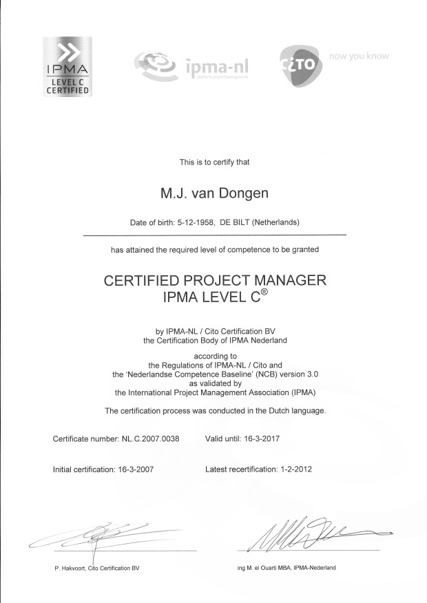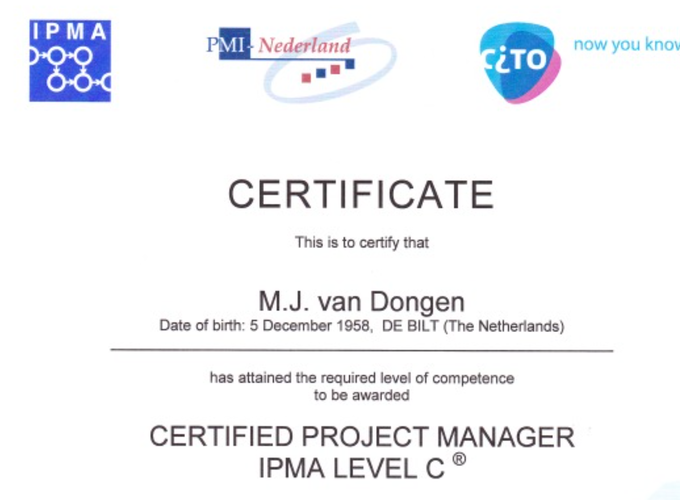 Gelukkig is het gelukt om het certificaat in 2007 te behalen en is deze in 2012 herbevestigd. In 2017 heb ik dit niet nogmaals herbevestigd omdat er binnen de organisatie totaal geen behoefte aan was.